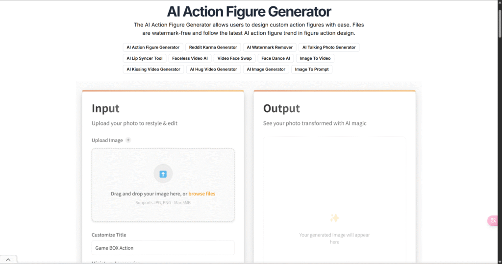 - Customization Options: Before generating the image, you can add a custom title for your action figure and even list specific “miniature accessories” you want to be included in the packaging.